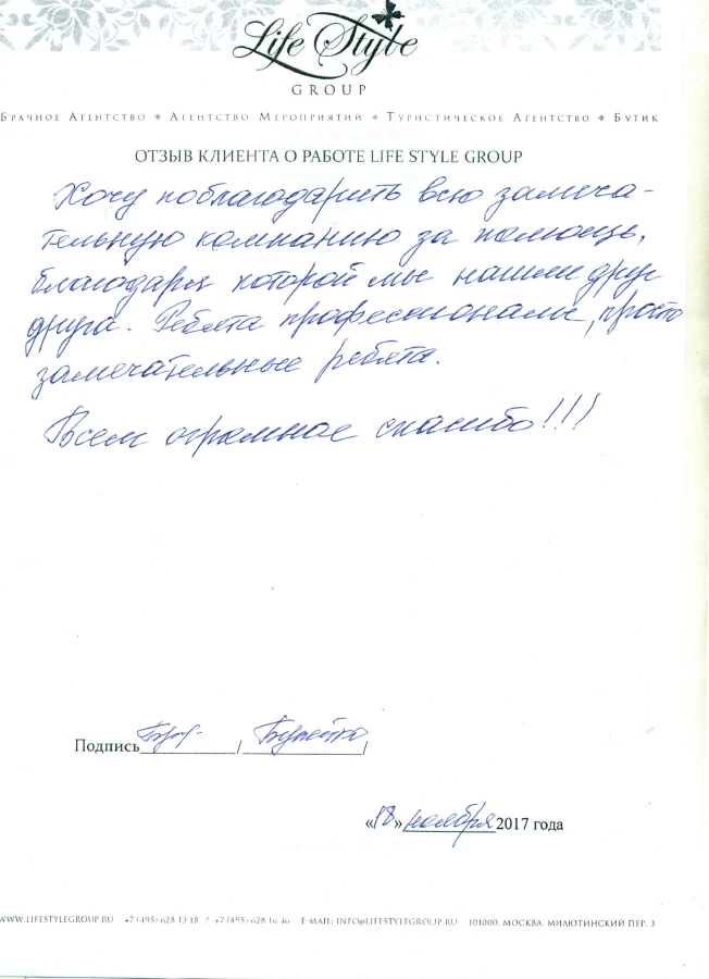 Life Style Group – современная компания свадебной индустрии, отличающаяся от существующих служб знакомств и брачных агентств, собственными эффективными методиками и технологиями, созданными на основе российского и международного опыта в области семейной психологии и коучинга, детальным анализом запросов каждого Клиента и современного рынка услуг, регулярным контролем качества и динамичностью, а также строгой приверженностью к высокими стандартам сервиса, которые позволяют нам быть впереди и превосходить ожидания Клиентов!