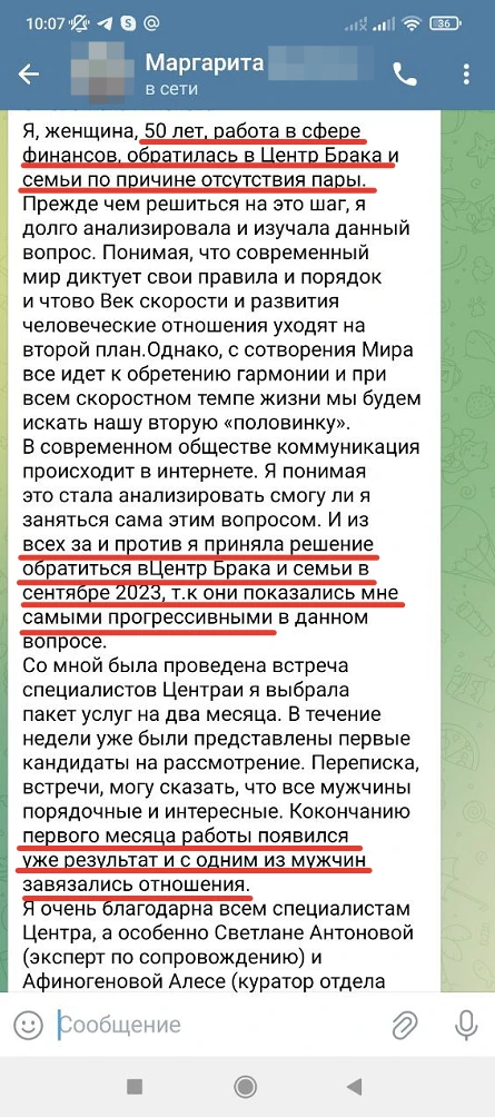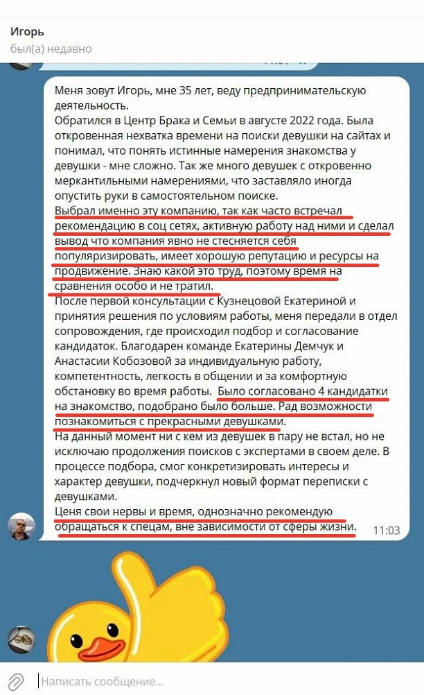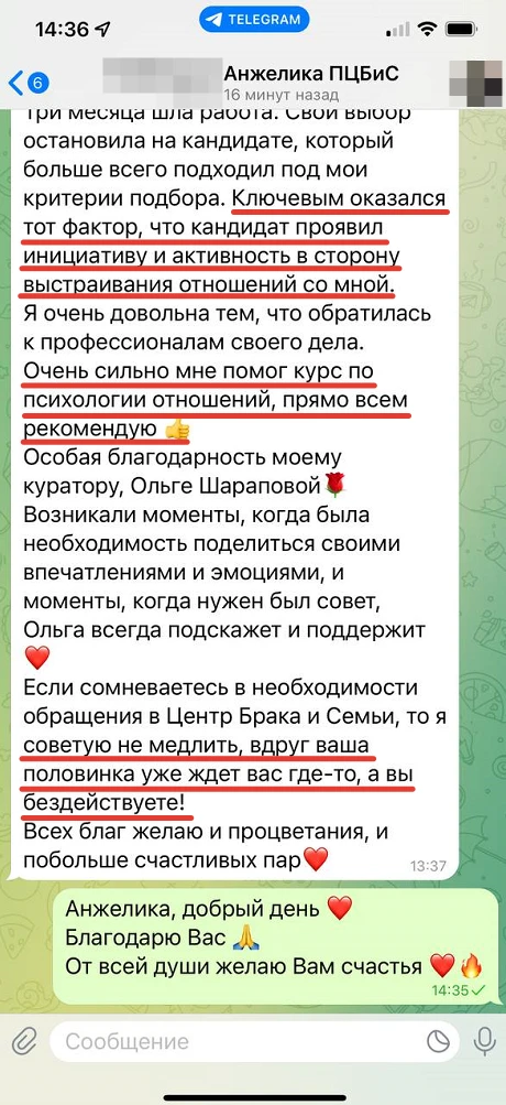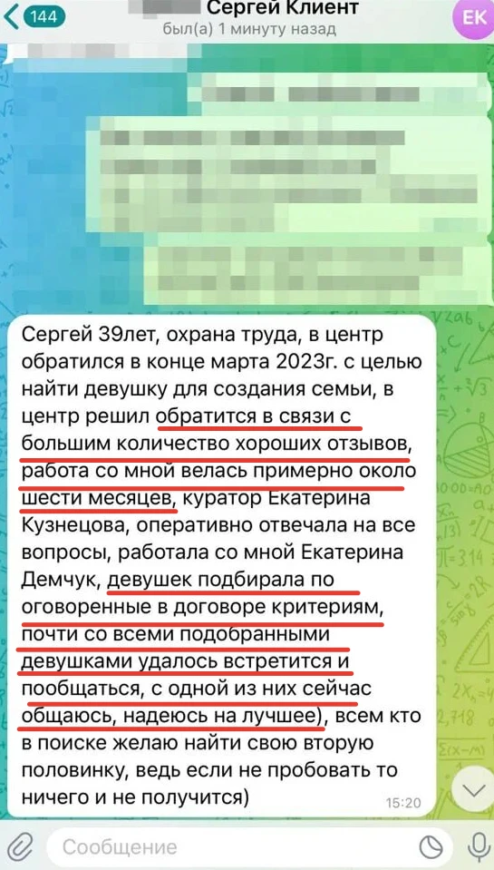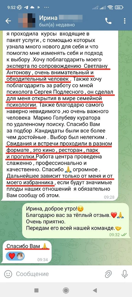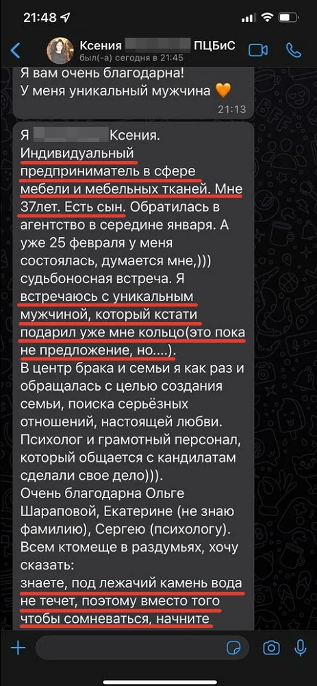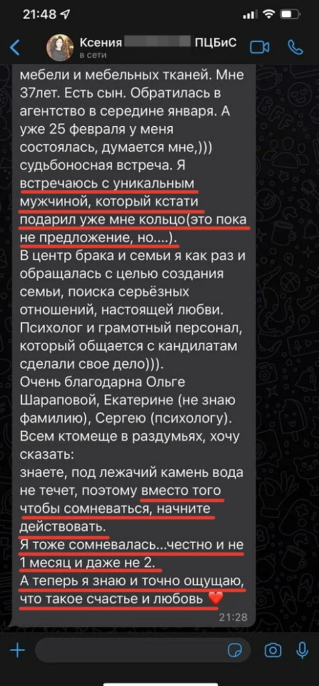 Мы не просто направляем Вам анкетные данные человека с фотографией, мы его презентуем, направляя Вам только проверенную информация, раскрывая потенциал кандидата, особенности, его сильные и яркие черты характера, и таким же филигранным способом мы находим точки соприкосновения с Вами и Вашими предпочтениями, чертами характера, интересами, взглядами!